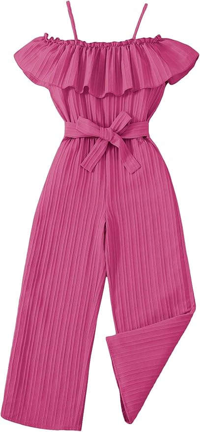 Girl's Ruffle Trim Cold Shoulder Short Sleeve Belted Wide Leg Jumpsuit Pants