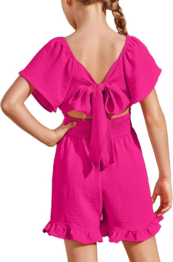 Girls Summer Jumpsuits Tie Back Off Shoulder Short Sleeve One Piece Rompers Ruffle Smocked Casual Shorts Outfits