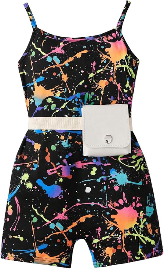 Girl's One Piece Splash Ink Print Cami Romper Sleeveless Crewneck Short Jumpsuits