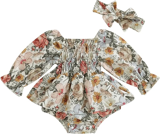 Infant Baby Girl Romper Off Shoulder Long Sleeve Ruffle Floral Jumpsuit Headband Onesie Boho Fall Winter 2PCS Outfits
