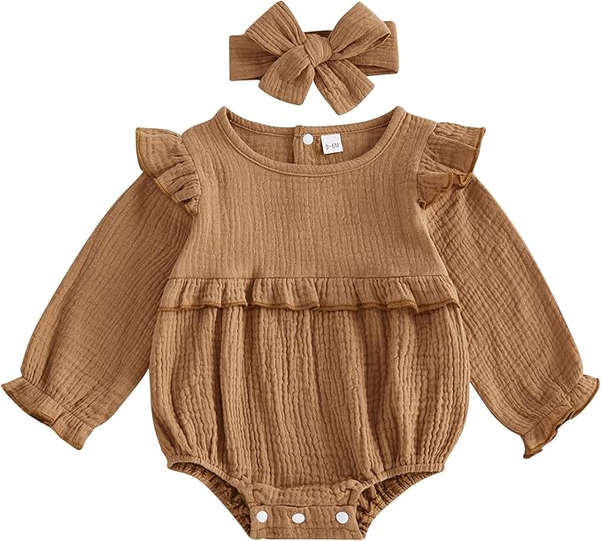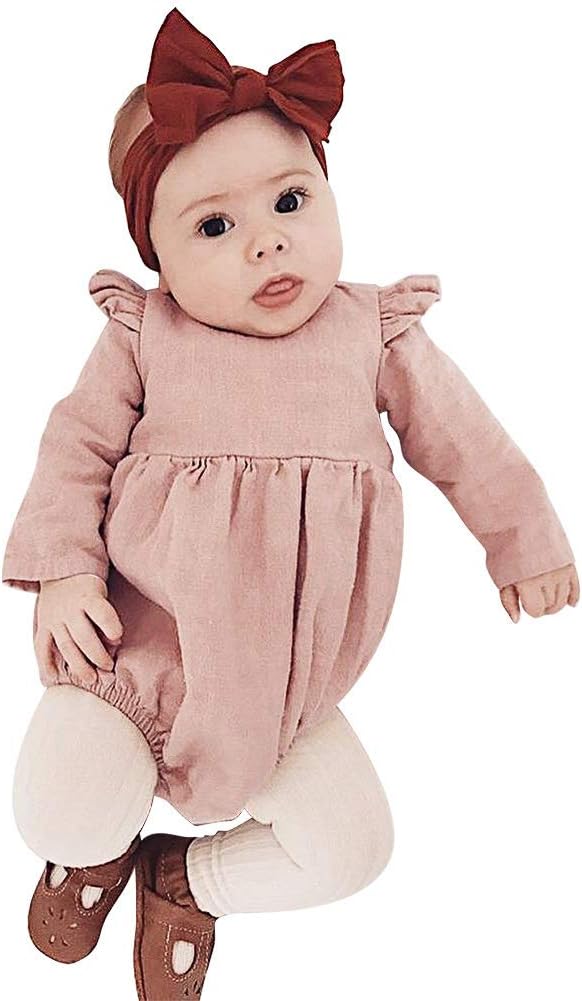 Newborn Infant Baby Girl Clothes Cotton Linen Long Sleeve Smocked Bubble Romper Ruffle Bodysuit Jumpsuit Fall Outfit