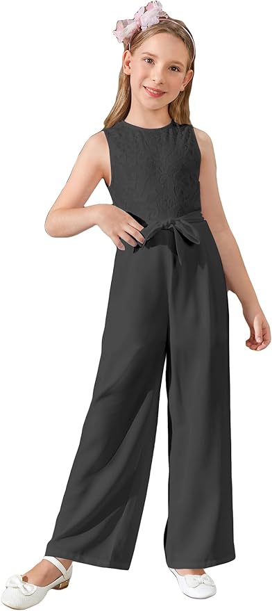 Girl's Lace Round Neck Sleeveless Belted Wide Leg Jumpsuit Pants