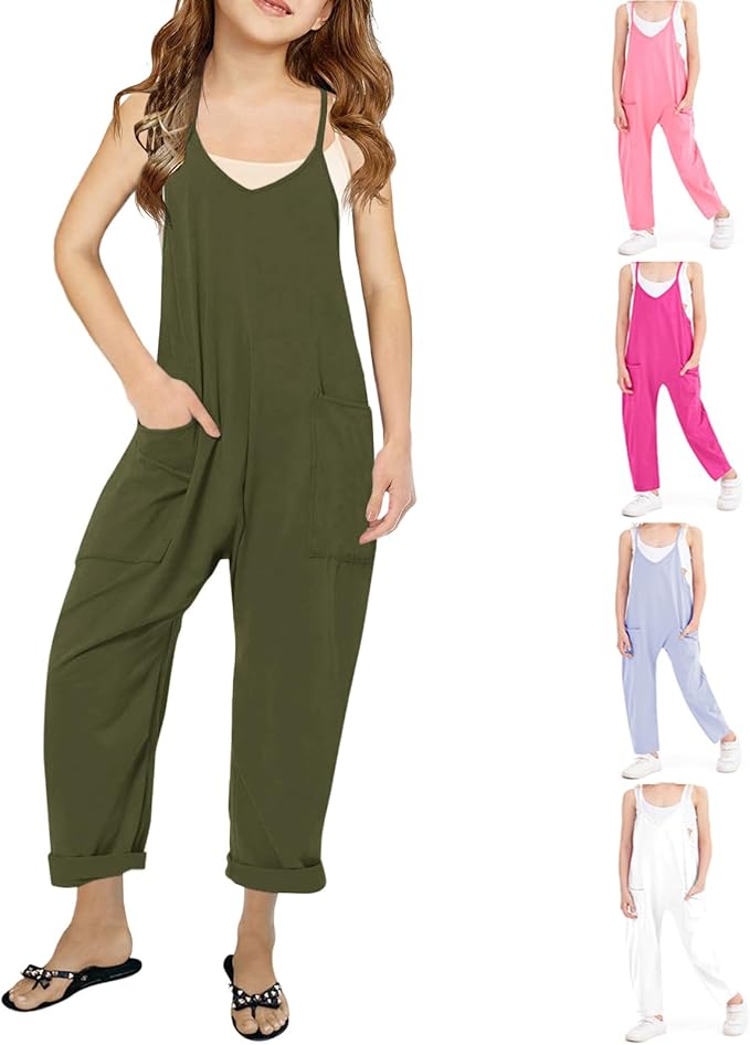 Jumpsuits for Girls Kids Casual Sleeveless Jumpsuits Spaghetti Strap Romper Long Pants with Pockets