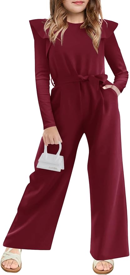 Girls Jumpsuit Kids Fashion Ruffle Long Sleeve Belted Wide Leg Romper One Piece Fall Outfits 5-14 Years