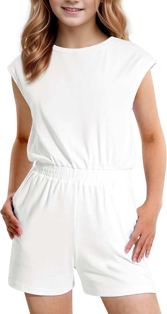 Girls Jumpsuit Shorts Crew Neck Sleeveless Romper with Pockets 5-14 Years