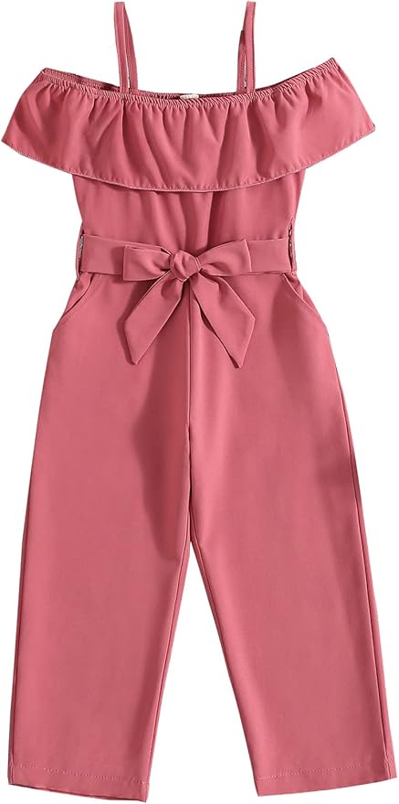 Girls Off Shoulder Ruffle Trim Romper Jumpsuit with Side Pockets Bow tie belt Little Girls One Piece Summer Pants