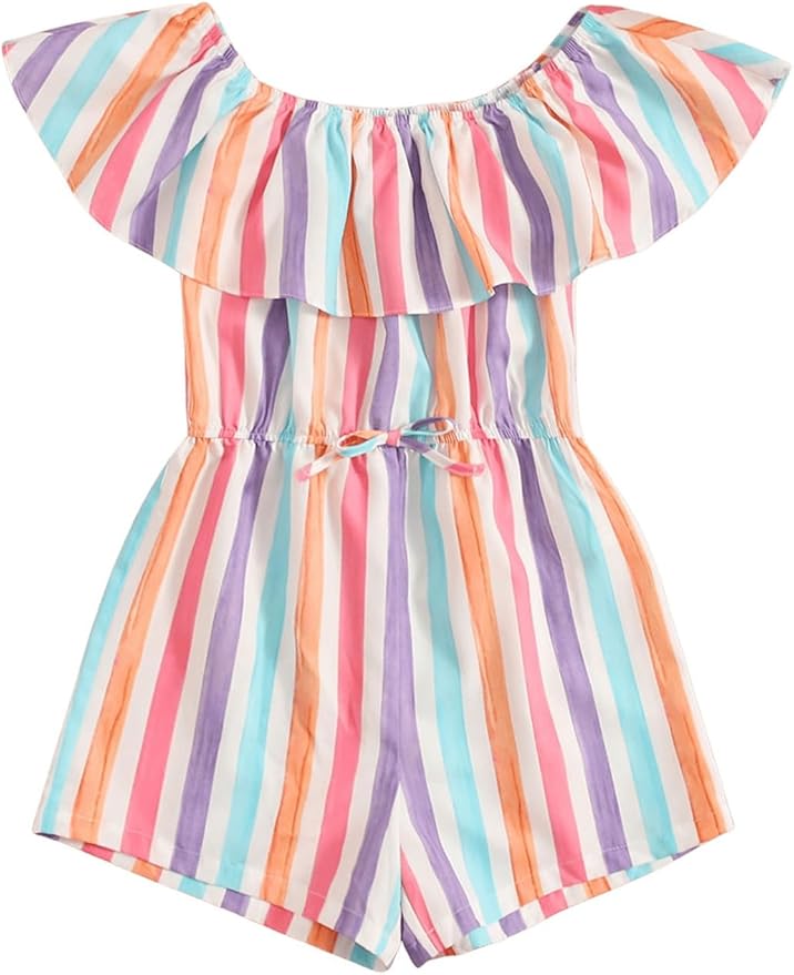 Girl's Ruffle Trim Knot Foldover Elastic Waist Rainbow Striped Romper Short Jumpsuit